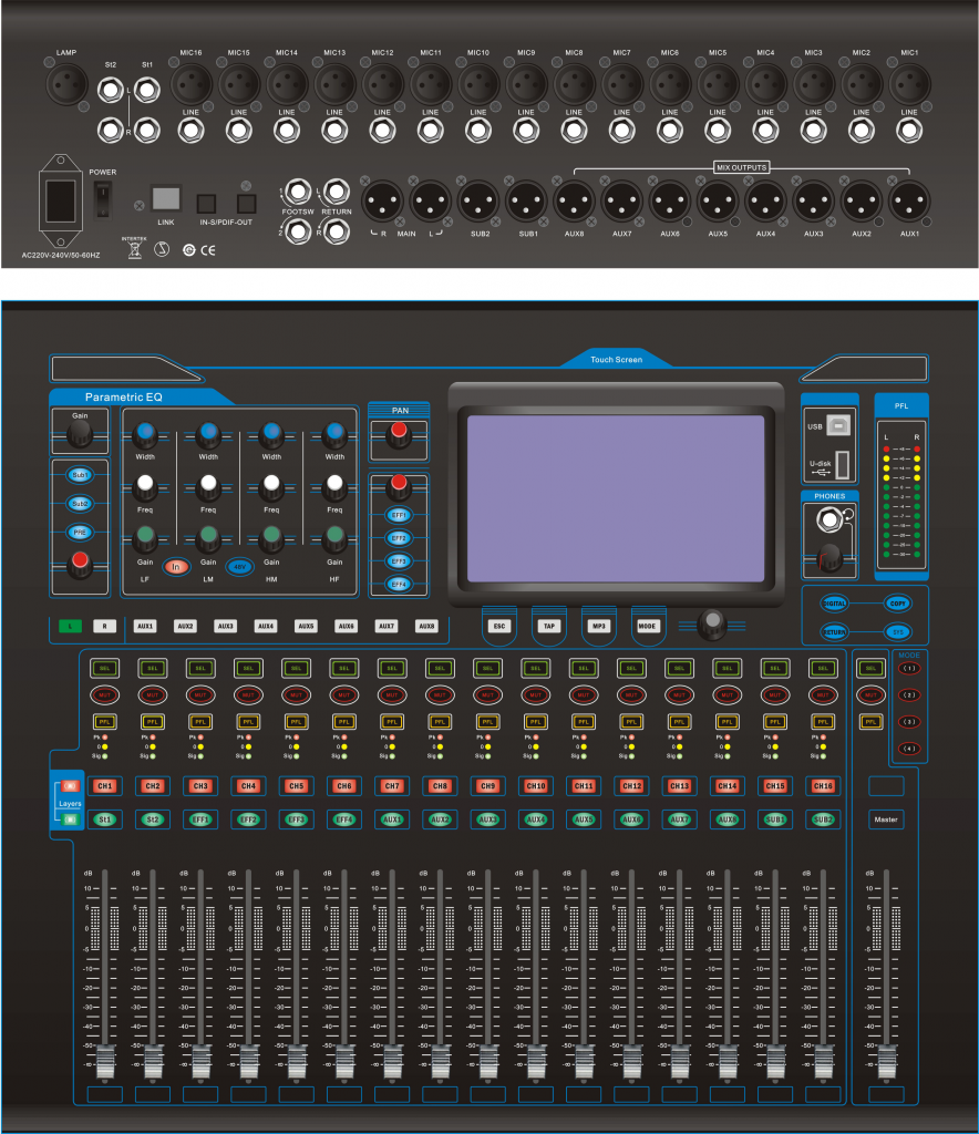 功能参数 12单声道输入通道,12个话筒兼容线路输入,具有 1 组效果返送,2 组立体声输入通道(4 路单声道 […]